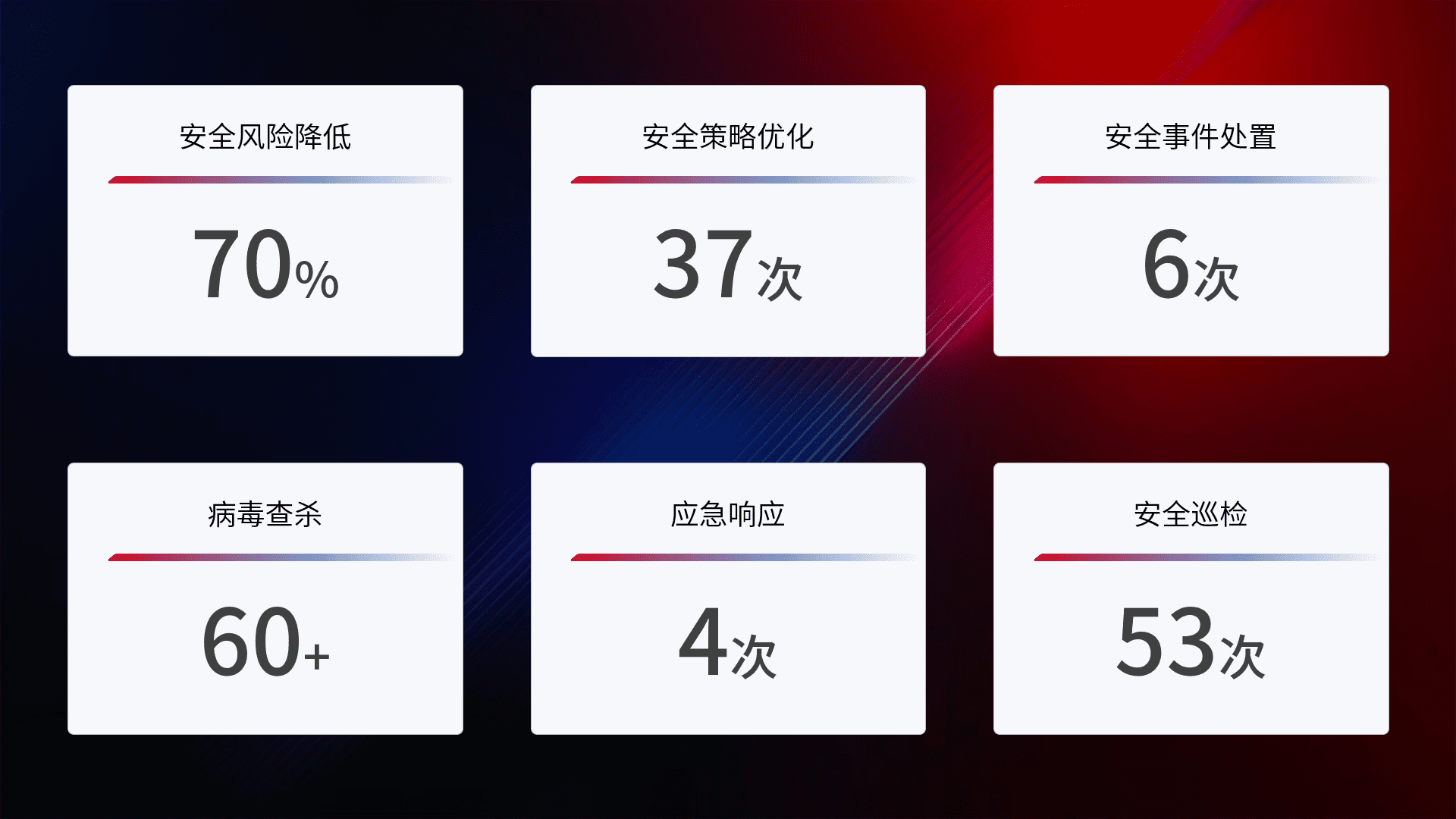 提供全面的安全事件报告体系,,,包括处置报告、、周报、、、、季度和年度总结,,,,结合持续监控,,,,帮助客户深入了解网络安全状况。。。。